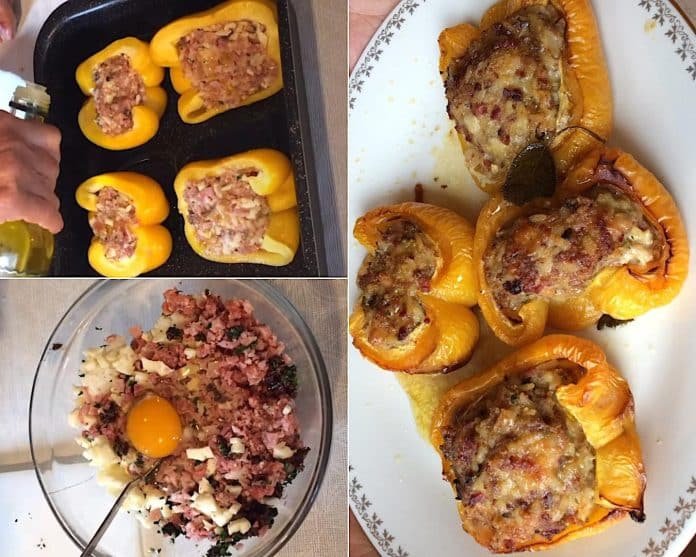 - Sembrar los pimientos y rellenar con la mezcla de carne,