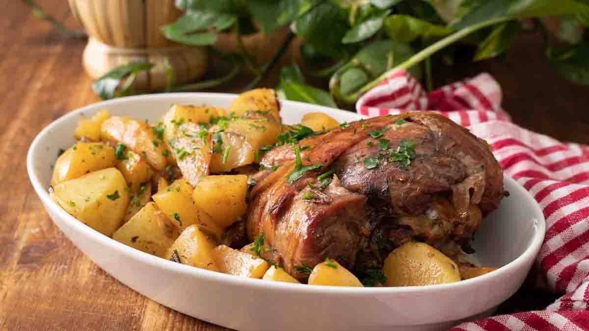 5 hojas de laurel 1 kg de patatas 4 cebollas blancas 2 vasos de vino tinto 3 kg de muslo de pavo Sabores del asado