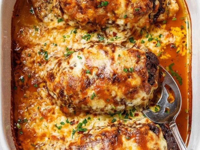 Esta cazuela con pollo encebollado gratinado es deliciosa cuando se sirve con verduras verdes al vapor, arroz o patatas asadas. Es perfecto para una comida familiar o para recibir invitados. ¡Buen provecho!