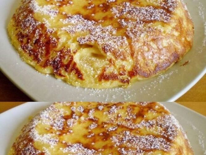 - Retire la sartén del fuego y deje que el pastel se enfríe un poco antes de cortarlo en porciones y servirlo. Espolvorear con azúcar glas o canela al gusto.