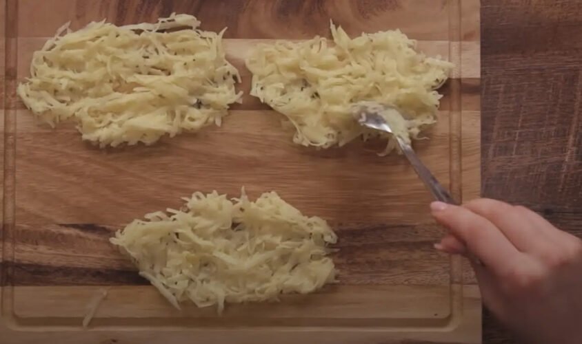 - Comenzamos pelando y rallando las patatas. Añadimos un huevo, sal, pimienta, y mezclamos todo bien.