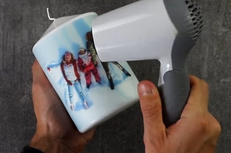 - Sella la imagen aplicando calor con un secador de cabello o pistola de aire caliente. Asegúrate de protegerte las manos si usas un secador. Sigue aplicando calor hasta que veas que la tinta de la foto se transfiere a la vela.