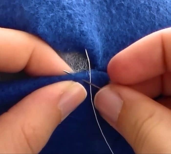 Tercer Paso: Inicio de la Puntada Abre el agujero e introduce la aguja por la parte inferior del tejido superior. Luego, lleva la aguja hacia el tejido inferior, recogiendo una porción del material cerca de la zona doblada.
