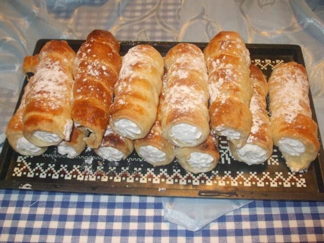 - Llena una manga pastelera con esta mezcla y rellena los rollos de hojaldre. Espolvorea con azúcar glas o decora al gusto.