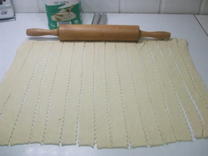 - Corta la masa en tiras de 3 x 32 cm y enróllalas en forma de tubos. Pincela la parte superior con clara de huevo y hornea a 200 grados Celsius durante aproximadamente 15 minutos, o hasta que estén dorados. Retíralos del horno mientras aún estén calientes.