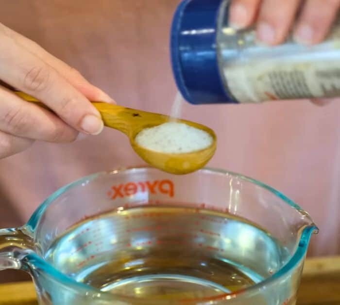 Paso 1: Preparación de la salmuera En un recipiente, agrega cuatro tazas de agua tibia y mezcla con dos cucharadas soperas de sal. La temperatura del agua caliente facilitará la disolución de la sal. Asegúrate de lograr una mezcla homogénea.