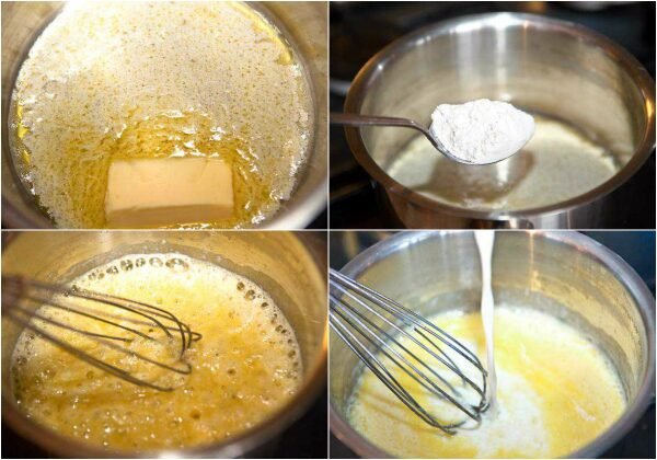 - Derrite la mantequilla, agrega la harina y mezcla constantemente. Cuando aparezca una espuma blanca, vierte la leche fría, la sal y continúa mezclando. Retira la cacerola del fuego cuando la salsa comience a hervir.