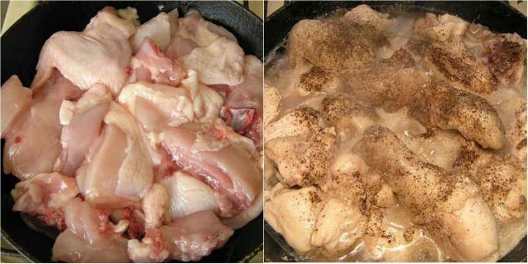 - Coloca la carne de pollo en una olla de fondo grueso o una sartén. No agregues aceite, solo un poco de agua, cubre con una tapa y cocina la carne a fuego lento en su propio jugo. Sazona ligeramente con sal y pimienta. Deja cocinar durante 35-45 minutos.