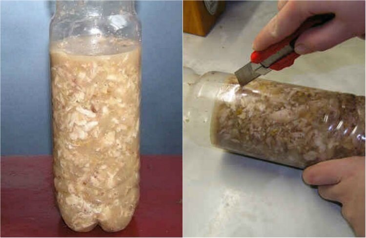 - Toma una botella de plástico limpia, corta el cuello y llénala con la mezcla enfriada. Coloca la botella en la nevera durante varias horas hasta que se solidifique por completo. Una vez que la tlačenka esté lo suficientemente firme, retírala cuidadosamente cortando la botella.