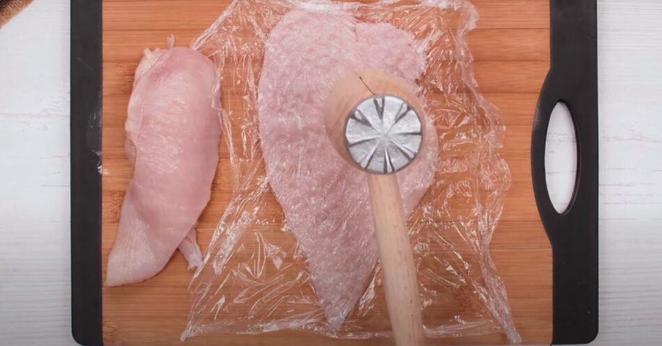 - Lave, seque y corte las pechugas de pollo en lonjas. Cúbralas con papel film o una bolsa y golpéalas ligeramente. Sazone con sal y pimienta.