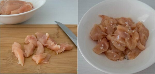 1. Lava, seca y corta las pechugas de pollo según tu preferencia. Agrega sal, bicarbonato de sodio y mezcla bien.