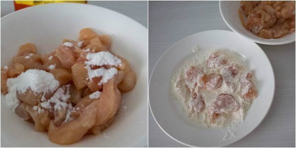 2. Vierte el jugo de limón sobre la carne, agrega el almidón y mezcla. Deja reposar durante 20 minutos y luego rebosa cada trozo con harina.