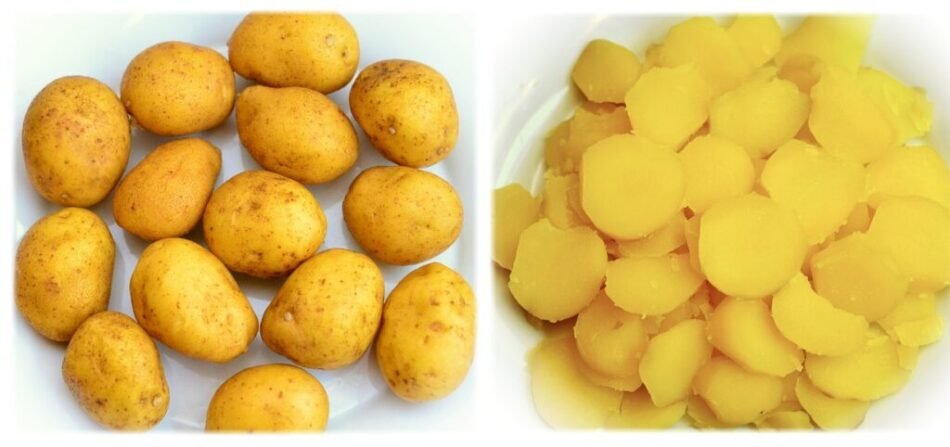 - Corta las papas en rodajas finas y cuécelas en agua hirviendo durante 5 minutos. Luego, colócalas sobre la carne.