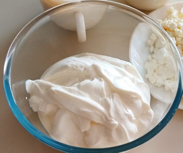 - En un tazón, combinar el yogur griego con aceite, mostaza, orégano, pimienta negra y sal.