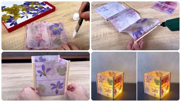 - Una vez que los paneles florales estén secos, ensambla la lámpara utilizando palitos de madera y pegamento.