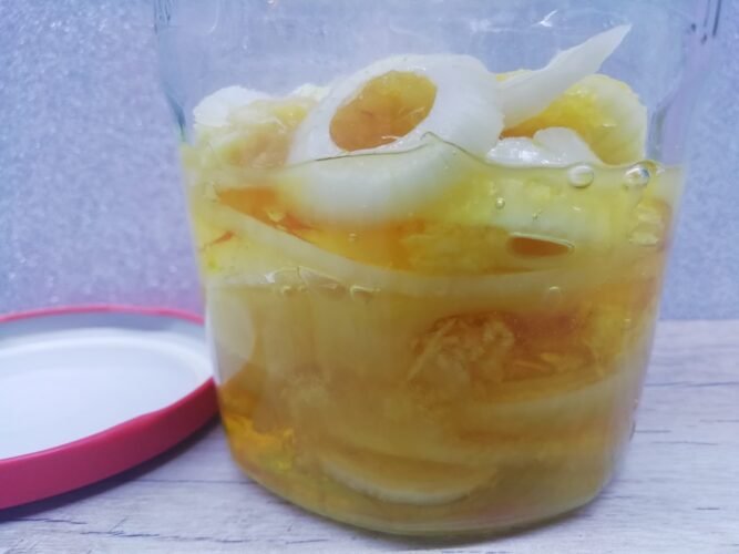 2. En el vaso con tapa, colocar capas alternas de cebolla y miel.