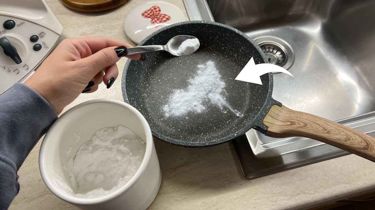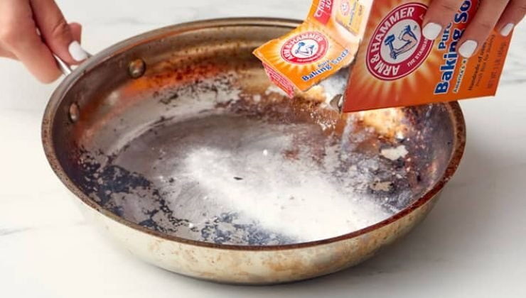 - Espolvorea generosamente bicarbonato en la superficie de la sartén.