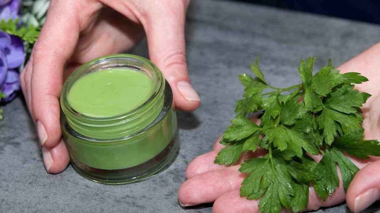 Toma perejil y tritúralo junto con 100 ml de leche. El primer ingrediente ayuda a tonificar la piel, el segundo a aclararla e hidratarla. Después de hacer este paso, tamiza la mezcla: obtendrás una crema espesa que deberás verter en un frasco de vidrio.
